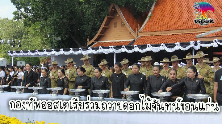 ขณะเดียวกัน พันโทสัญญา โ ยธานันต์ ผู้บังคับกองพันทหารราบที่ 3 กรมทหารราบที่ 8 ค่ายสีหราชเดโชไชย จ.ขอนแก่น ได้นำผู้แทนกองทัพบกออสเตรเลียร่วมพิธีถวายดอกไม้จันทน์ งานพระบรมศพฯ ในโอกาสที่เดินทางมาฝึกร่วมกองทัพบกไทย- ออสเตรเลีย รหัส Chapel Gold 2017 ที่กรมทหารราบที่ 8 ค่ายสีหราชเดโชไชย จังหวัดขอนแก่น ระหว่างวันที่ 20 ตุลาคม ถึง 4 พฤศจิกายน 2560 เพราะประเทศไทยและออสเตรเลียมีความสัมพันธ์อันดีต่อกันสืบเนื่องจากพระบาทสมเด็จพระปรมินทรมหาภูมิพลอดุลยเดช บรมนาถบพิตร ได้เคยส่งสมเด็จพระเจ้าอยู่หัวรัชกาลที่ 10 ไป ทรงศึกษา วิชาการทหาร ที่วิทยาลัยทหารดันทรูนประเทศออสเตรเลีย