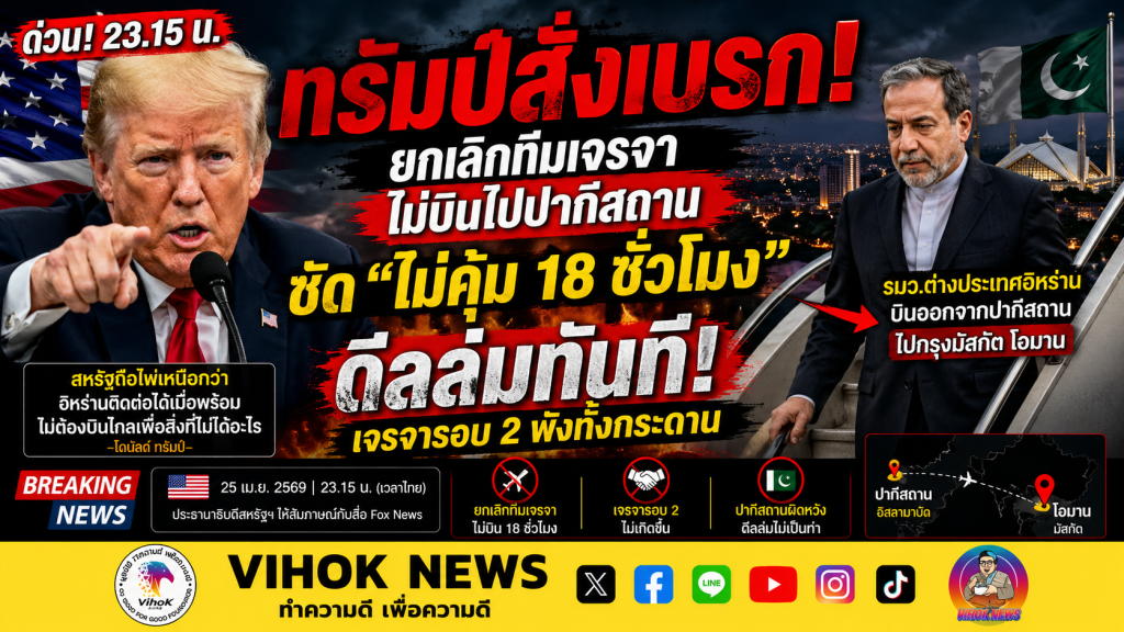 วิหคนิวส์-วันที่ 25 เม.ย. 2569 เวลาประมาณ 23.15 น. ตามเวลาไทย ประธานาธิบดีโดนัลด์ ทรัมป์ ของสหรัฐอเมริกา เปิดเผยผ่านการให้สัมภาษณ์กับสื่อในประเทศว่า ได้สั่งยกเลิกการเดินทางของทีมผู้แทนเจรจาสหรัฐฯ ที่กำลังเตรียมบินไปกรุงอิสลามาบัด ประเทศปากีสถาน