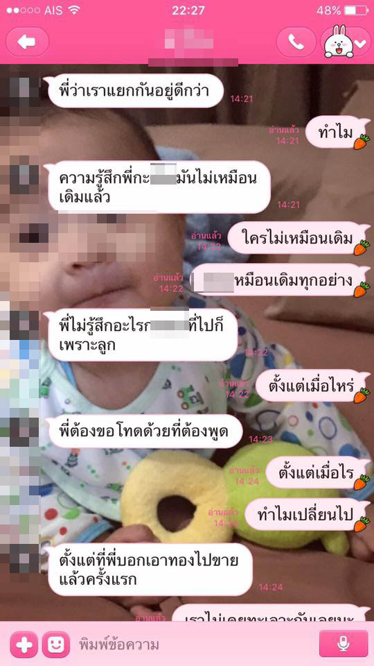 จากในภาพคุณ Baitong Prapatsorn ได้เผยว่าตนเองแต่งงานกับสามีตั้งแต่ปี 58 กระทั่งปี 2559 ทั้งคู่มีโซ่คล้องใจ 1 คน เวลาผ่านไป 7 เดือน จู่ๆสามีขอแยกทาง ให้เหตุผลว่ารู้สึกไม่เหมือนเดิม ทว่าแม่สามีโทรมาบอกว่า สามีทำผู้หญิงอีกคนท้อง อายุครรภ์ได้เดือนกว่าแล้ว สุดท้ายเธอฝากข้อความว่า “คนที่จะต้องอายไม่ใช่เราค่ะ คนที่ทำผิดต่างหากที่ต้องอาย”