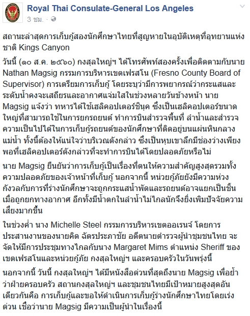 วันนี้ทางทีมงานวิหคนิวส์ได้นำข้อมูลมาจากเพจเฟสบุ๊ค Royal Thai Consulate-General Los Angeles ได้ออกมาโพสต์ถึงความคืบหน้ากรณีน้องมิน – น้องกอล์ฟ 2 นักศึกษาชาวไทย ขับรถตกเหวที่สหรัฐฯ ถึงการกู้ซากรถ แต่ทางเจ้าหน้าที่ทำได้เพียงแค่โรยตัวเข้าไปดูใกล้ๆซากรถ แต่ยังไม่สามารถกู้ได้ เพราะอะไรนั้นตามไปอ่านได้ภายโนโพสต์ ระบุว่า
