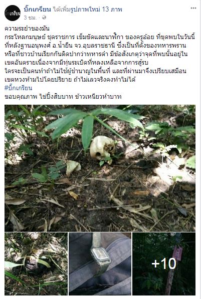 กระโหลกมนุษย์ ชุดราชการ เข็มขัดและนาฬิกา ของครูอ้อย ที่ขุดพบในวันนี้ที่หลังฐานอนุพงศ์ อ.น้ำยืน จว.อุบลราชธานี ซึ่งเป็นที่ตั้งของทหารพราน หรือที่ชาวบ้านเรียกกันติดปากว่าทหารดำ มีข้อสังเกตุว่าจุดที่พบนั้นอยู่ในเขตอันตรายเนื่องจากมีทุ่นระเบิดที่หลงเหลือจากการสู้รบ