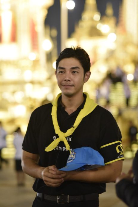 ขณะที่ นายพศุตม์ บานแย้ม หรือ อาร์ต ชาว จ.สมุทรสาคร อายุ 35 ปี อาชีพดารานักแสดง จิตอาสาบริการรับส่งประชาชนบริเวณท้องสนามหลวงโดยไม่คิดค่าบริการ กล่าวว่า ปฏิบัติงานจิตอาสามาตลอด 1 ปี ตั้งใจอำนวยความสะดวกประชาชนประชาชนตั้งแต่สำนักพระราชวังเปิดให้ประชาชนถวายบังคมพระบรมศพในหลวง รัชกาลที่ 9 จนถึงวันที่ปิดเข้ากราบพระบรมศพ และในช่วงสุดท้ายวันที่ 24 และ 25 ต.ค.ก่อนพระราชพิธีถวายพระเพลิง ตนขับจักรยานยนต์อำนวยความสะดวกประชาชนในช่วงเวลา 18.00 น. ถึง 02.00 น. ส่วนใหญ่รับส่งจากสนามหลวงไปจุดเชื่อมต่อการเดินทางที่สำคัญ ไกลสุดไปเขตอ่อนนุช เคยเติมน้ำมันรถ 150 ซีซี เต็มถัง2ครั้ง รวมระยะทางไม่ต่ำกว่า 170 กิโลเมตรต่อวัน ภาคภูมิใจที่ได้เป็น 1 ใน 33 จิตอาสาพระราชทานทำคุณประโยชน์เพื่อส่วนรวม และจะมุ่งมั่นทำความดีต่อไป ตนสำนึกอยู่เสมอว่า ในหลวง รัชกาลที่ 9 ทรงเป็นต้นแบบของการทำความดีและมีพระเมตตา และจะดำเนินรอยตามสมเด็จพระเจ้าอยู่พระกษัตริย์ผู้ทรงมีระเบียบวินัยยิ่ง