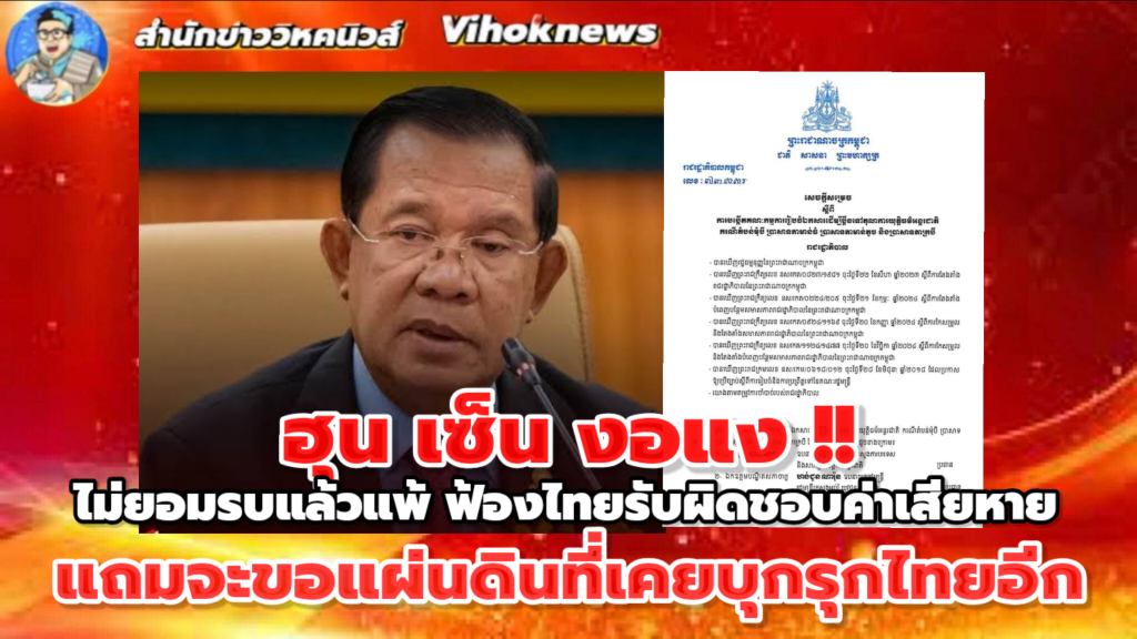 ฮุนเซน ไม่ยอม ลุยฟ้องไทย ชดเชยค่าเสียหายให้เขมร โดยตอนนี้ได้สั่งให้กระทรวงและ หน่วยงานที่เกี่ยวข้องเตรียมเอกสารทางกฎหมายอย่างเร่ง ด่วนเพื่อฟ้องประเทศไทยต่อศาลยุติธรรมระหว่างประเทศ ตามที่เขากล่าว คดีนี้จะเน้นไปที่ข้อกำหนดหลักสองประการ และข้อกำหนดบังคับสำหรับฝ่ายไทย