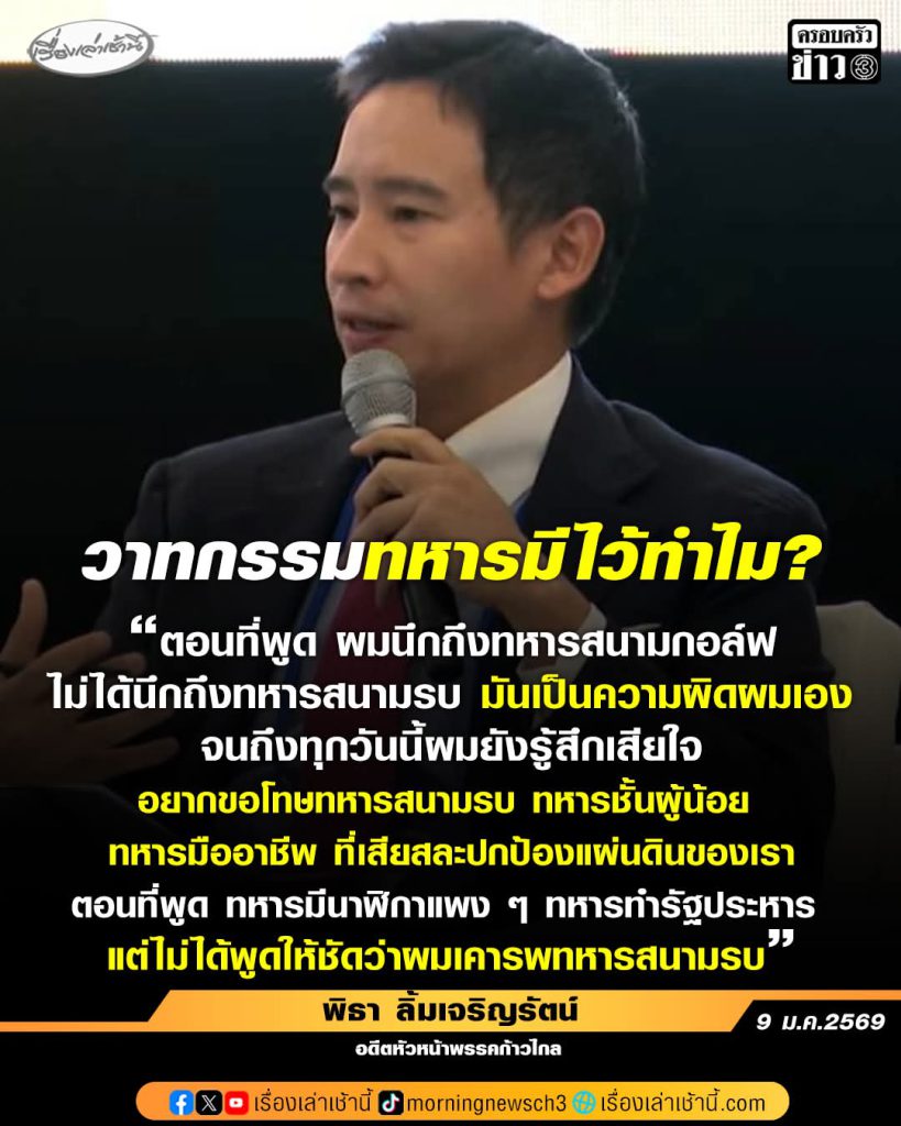 เรื่องเล่าเช้านี้ – นายพิธา ลิ้มเจริญรัตน์ อดีตหัวหน้าพรรคก้าวไกล เปิดเผยถึงกรณีกล่าววาทกรรม “ทหารมีไว้ทำไม” ขณะปราศรัยเลือกตั้งเมื่อปี 2566 ในการสนทนาแบบใกล้ชิด กับ พิธา และ กุลธิดา รุ่งเรืองเกียรติ ว่าด้วยอนาคตของประเทศไทย การมีส่วนร่วมของภาคประชาชน และการลงคะแนนเสียงของคนไทยในต่างแดน ซึ่งมีการไลฟ์ผ่านเพจ SiamTownUS ว่า ในตอนที่ผมพูด ผมนึกถึงทหารสนามกอล์ฟ ไม่ได้นึกถึงทหารสนามรบ มันเป็นความผิดของผมเอง จนถึงทุกวันนี้ผมยังรู้สึกเสียใจ