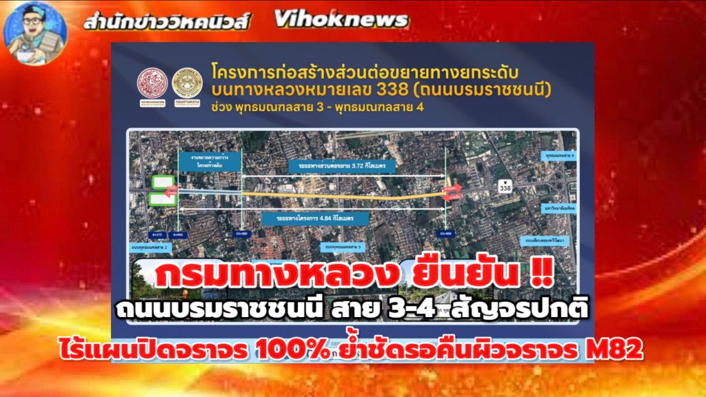 พร้อมระบุข้อความว่า “กรมทางหลวง ยืนยันถนนบรมราชชนนี (สาย 3-4) สัญจรปกติ ไร้แผนปิดจราจร 100% ย้ำชัด ‘รอคืนผิวจราจร M82 บน ถ.พระราม 2 ก่อนเริ่มงานก่อสร้างต่อขยายทางยกระดับบน ถ.บรมราชชนนี’ มุ่งลดผลกระทบการเดินทางประชาชนเป็นสำคัญ”