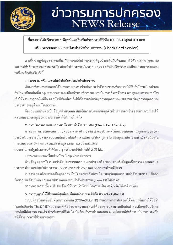 ระบุว่า ตามที่ปรากฏข้อมูลข่าวสารเกี่ยวกับการขอใช้บริการระบบพิสูจน์และยืนยันตัวตนทางดิจิทัล (DOPA-Digital ID) และการให้บริการตรวจสอบสถานะบัตรประจําตัวประชาชนในระบบ Laser ID