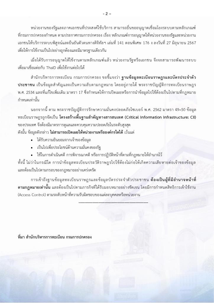 ตามประกาศกรมการปกครอง เรื่อง หลักเกณฑ์การอนุญาตให้หน่วยงานของรัฐและหน่วยงาน เอกชนให้บริการระบบพิสูจน์และยืนยันตัวตนทางดิจิทัลฯ เล่มที่ 141 ตอนพิเศษ 176 ง ลงวันที่ 27 มิถุนายน 2567 เพื่อให้การใช้งานเป็นไปอย่างถูกต้องและมีมาตรฐานเดียวกัน