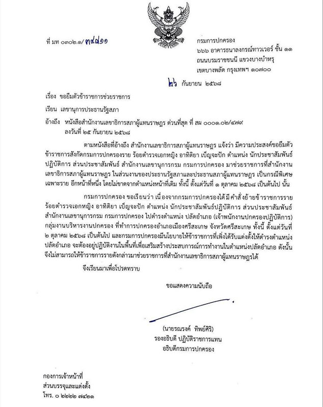 ประธานสภาผู้แทนราษฎร มีความประสงค์ขอยืมตัว ร้อยตำรวจเอกหญิง อาทิติยา เบ็ญจะปัก นักประชาสัมพันธ์ปฏิบัติการ สังกัดสำนักงานเลขานุการกรม กรมการปกครอง กระทรวงมหาดไทย มาช่วยราชการที่สำนักงานเลขาธิการสภาผู้แทนราษฎร ในส่วนงานของประธานรัฐสภาและประธานสภาผู้แทนราษฎร เป็นกรณีพิเศษเฉพาะราย อีกหน้าที่หนึ่ง โดยไม่ขาดจากตำแหน่งหน้าที่เดิม ทั้งนี้ นับตั้งแต่วันที่ 1 ต.ค. 2568 เป็นต้นไป นั้น