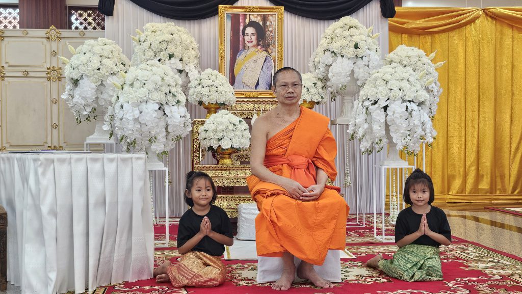 อิมานิ มะยัง ภันเต รัตตะวัตถานิ สะปะริวารานิ สารีริกะธาตุ ปูชนัตถายะ ภิกขุสังฆัสสะ โอโณชะยามะ สาธุ โน ภันเต ภิกขุสังโฆ อิมานิ รัตตะวัตถานิ สะปะริวารานิ ปฏิคคัณหาตุ อัมหากัง ทีฆะรัตตัง หิตายะ สุขายะฯ