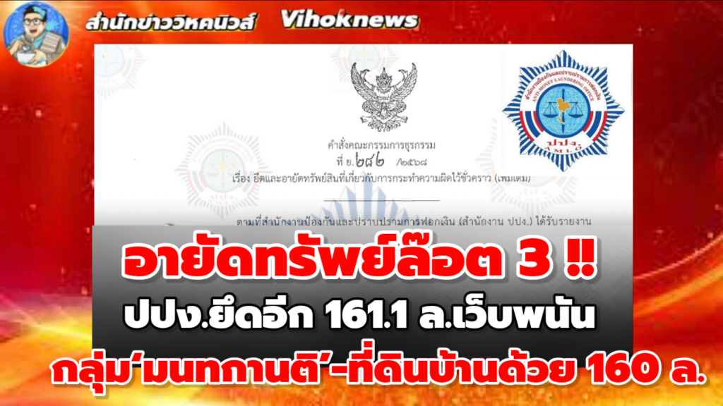 ปปง.ยึดอายัดทรัพย์ลอต 3 อีก 161.1 ล.เว็บพนันกลุ่ม ‘มนทกานติ’ ที่ดินสิ่งปลูกสร้างในกรุงเทพฯมูลค่าสูง 160 ล. เปิดให้เล่นสารพัด ฟุตบอล หวย บาคารา สลอต ไก่ชน ก่อนหน้าโดน เงินฝาก 2 ครั้ง เงินสด เงินฝาก 13 รายการ 35.7 ล.