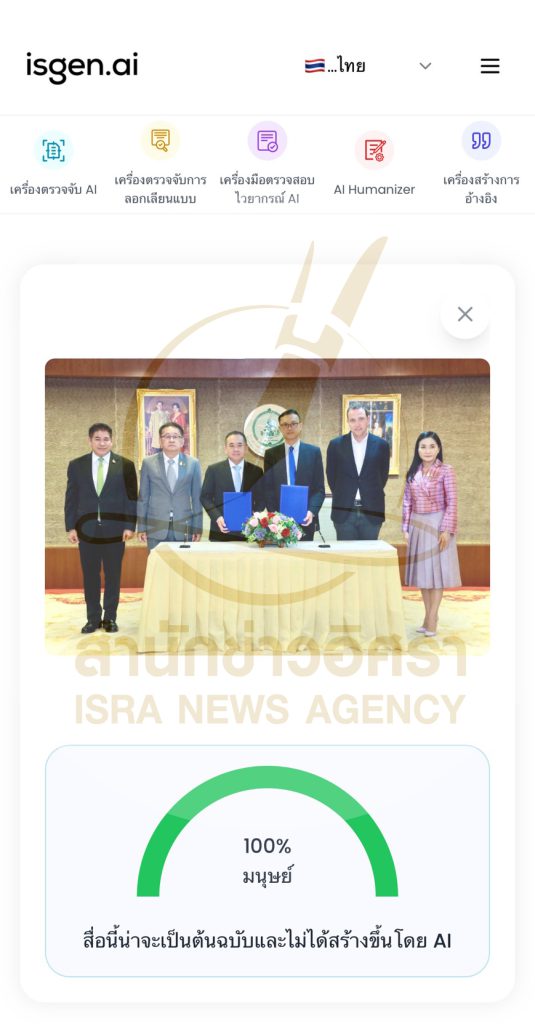 ขณะที่ สำนักข่าวอิศรา ได้ใช้โปรแกรม isgen.ai ตรวจสอบภาพถ่ายดังกล่าว ผลระบุว่า น่าจะเป็นภาพต้นภาพไม่ได้สร้างขึ้นโดย AI