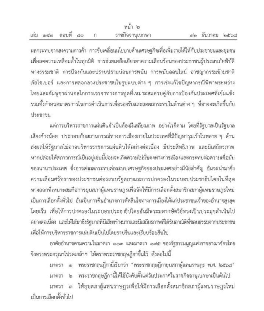 เพื่อให้การบริหารราชการแผ่นดินเป็นไปโดยราบรื่นและเรียบร้อยสืบไปอาศัยอำนาจตามความในมาตรา 103 และมาตรา 175 ของรัฐธรรมนูญแห่งราชอาณาจักรไทย จึงทรงพระกรุณาโปรดเกล้าฯ ให้ตราพระราชกฤษฎีกาขึ้นไว้ ดังต่อไปนี้มาตรา 1 พระราชกฤษฎีกานี้เรียกว่า “พระราชกฤษฎีกายุบสภาผู้แทนราษฎร พ.ศ. 2568”มาตรา 2 พระราชกฤษฎีกานี้ให้ใช้บังคับตั้งแต่วันประกาศในราชกิจจานุเบกษาเป็นต้นไป