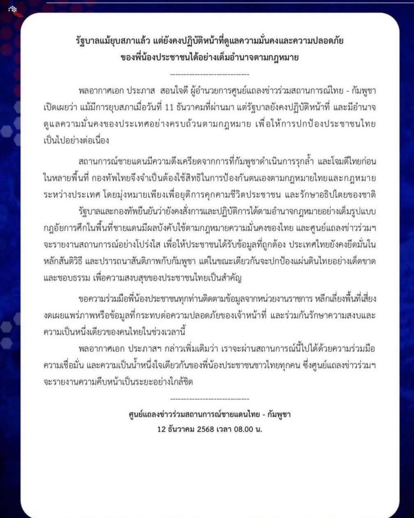 กฎอัยการศึกในพื้นที่ชายแดนมีผลบังคับใช้ตามกฎหมายความมั่นคงของไทย และศูนย์แถลงข่าวร่วมฯ