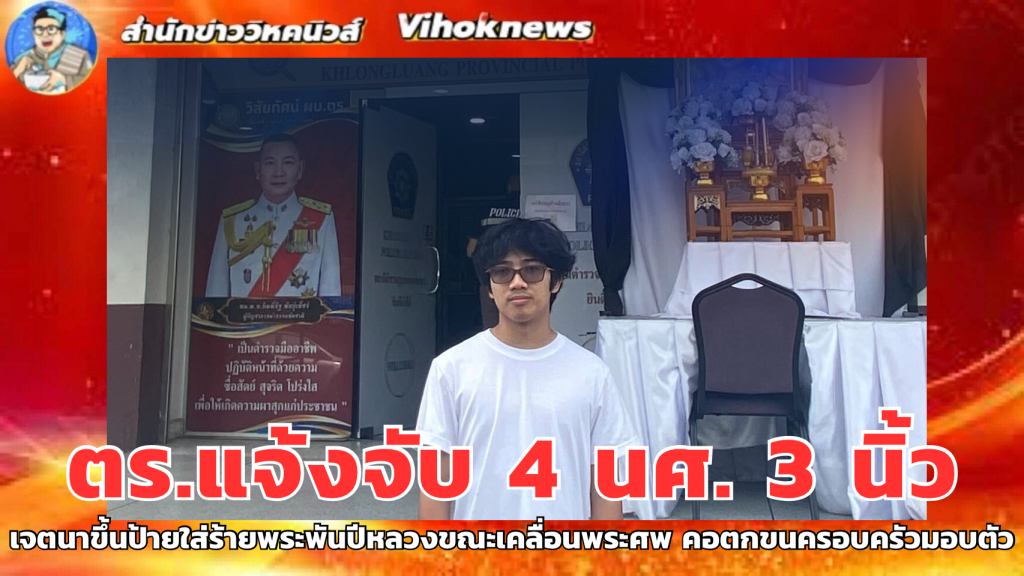 ตร.แจ้งจับ 4 นศ. 3 นิ้ว !! เจตนาขึ้นป้ายใส่ร้ายพระพันปีหลวงขณะเคลื่อนพระศพ คอตกขนครอบครัวมอบตัว