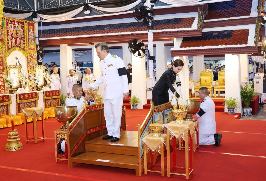 เมื่อเสด็จถึง พระบาทสมเด็จพระเจ้าอยู่หัวทรงจุดธูปเทียนเครื่องทองน้อยที่หน้าพระโกศ และทรงบูชาพระพุทธรูปประจำพระชนมวาร ก่อนประทับพระราชอาสน์ ขณะที่บรรพชิตจีนนิกาย 21 รูป เจริญพระพุทธมนต์เชิญดวงพระวิญญาณตามจารีตพิธี