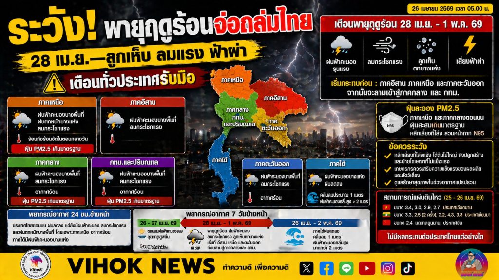 กรมอุตุนิยมวิทยารายงานพยากรณ์อากาศประจำวันที่ 26 เมษายน 2569 เวลา 05.00 น. ระบุว่า ประเทศไทยตอนบนยังมีฝนฟ้าคะนอง ลมกระโชกแรง และฝนตกหนักบางพื้นที่ แม้แนวโน้มฝนจะเริ่มลดลง ขณะที่อากาศยังคงร้อนต่อเนื่อง