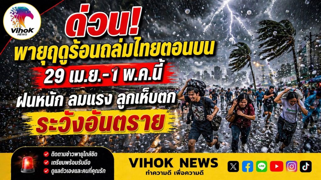 กรมอุตุนิยมวิทยาออกประกาศฉบับที่ 2 เตือนประชาชนรับมือพายุฤดูร้อนระลอกใหม่ เตรียมพัดถล่มประเทศไทยตอนบน ระหว่างวันที่ 29 เมษายน – 1 พฤษภาคม 2569 ส่งผลให้หลายพื้นที่มีฝนฟ้าคะนอง ลมกระโชกแรง ลูกเห็บตก และอาจเกิดฟ้าผ่าได้บางแห่ง