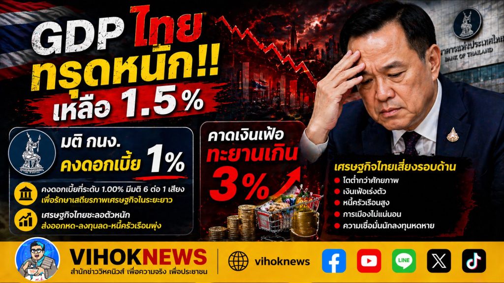 Apr 29, 2026 ตามคาด! กนง. มีมติเอกฉันท์ 6 ต่อ 0 เสียง คงอัตราดอกเบี้ยไว้ที่ 1% จับตาเงินเฟ้อพุ่งทะยาน 3% คาดเศรษฐกิจปีนี้โตเหลือ 1.5% จากผลกระทบสงครามตะวันออกกลาง ดันภาระต้นทุนภาคธุรกิจ