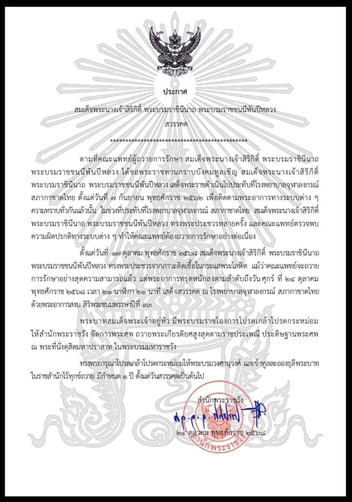 ความทราบทั่วกันแล้วนั้น ในช่วงที่ประทับที่โรงพยาบาลจุฬาลงกรณ์ สภากาชาดไทย สมเด็จพระนางเจ้าสิริกิติ์ พระบรมราชินีนาถ พระบรมราชชนนีพันปีหลวง ทรงพระประชวรหลายครั้ง และคณะแพทย์ตรวจพบความผิดปรกติทางระบบต่าง ๆ ทำให้คณะแพทย์ต้องถวายการรักษาอย่างต่อเนื่อง ตั้งแต่วันที่ 17 ตุลาคม พุทธศักราช 2568 สมเด็จพระนางเจ้าสิริกิติ์ พระบรมราชินีนาถพระบรมราชชนนีพันปีหลวง ทรงพระประชวรจากภาวะติดเชื้อในกระแสพระโลหิต แม้ว่าคณะแพทย์จะถวายการรักษาอย่างสุดความสามารถแล้ว แต่พระอาการทรุดหนักลงตามลำดับถึงวันศุกร์ ที่ 24 ตุลาคม พุทธศักราช 2568 เวลา 21 นาฬิกา 21 นาที เสด็จสวรรคต ณโรงพยาบาลจุฬาลงกรณ์ สภากาชาดไทย ด้วยพระอาการสงบ สิริพระชนมพรรษาปีที่ 93