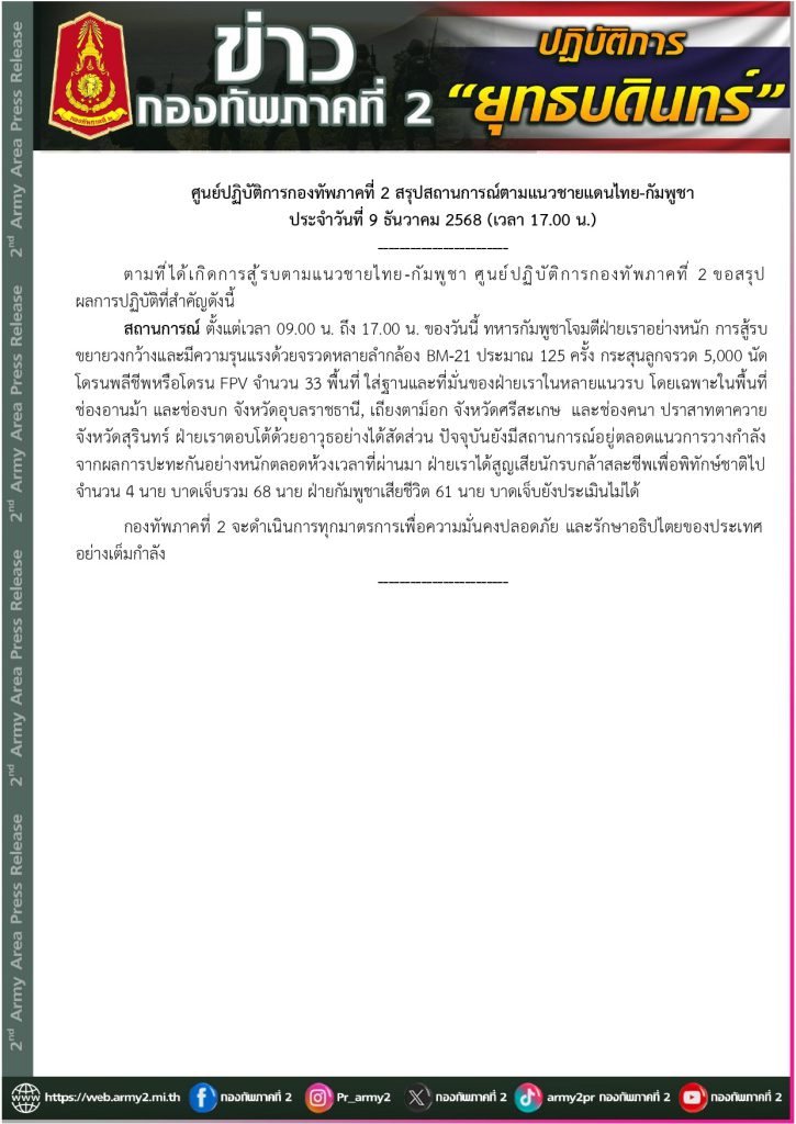 เมื่อวันที่ 9 ธ.ค.68 รายงานข่าวจากกองทัพภาคที่ 2 เปิดเผยว่า การสู้รบบริเวณชายแดนไทย -กัมพูชา ต่อเนื่องเป็นวันที่ 3 แต่เพียงวานนี้ (8 ธ.ค.) วันเดียว พบว่าทางฝั่งทหารกัมพูชา 61 คน โดยนำมาจากยอดที่ทหารกัมพูชาได้โพสต์ ลงโซเชียล หลังจากถูกทหารไทยทำลายอาคาร กองบัญชาการ กองพลสนับสนุนที่ 9 (พล.สสน. 9 ) ซึ่งเป็นจุดรวมพล ของกองกำลัง BHQ -สำนักข่าวไทย