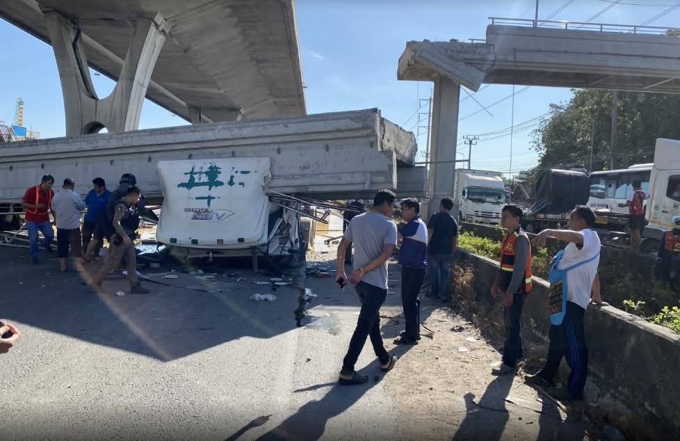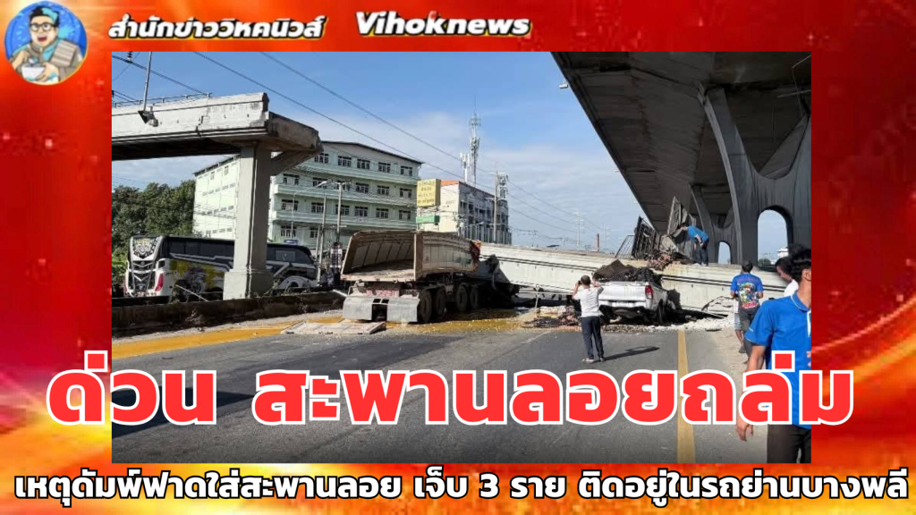ด่วน สะพานลอยถล่ม !! เหตุดัมพ์ฟาดใส่สะพานลอย เจ็บ 3 ราย ติดอยู่ในรถย่านบางพลี