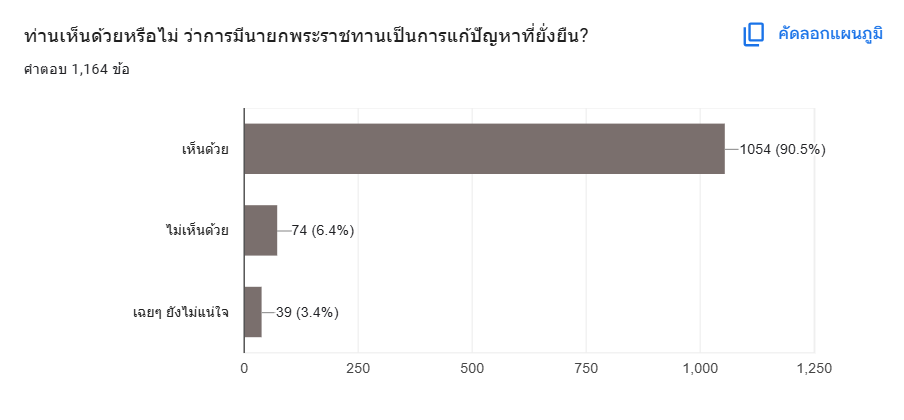 ร้อยละ 90.5 ระบุว่า เห็นด้วย ว่าการมีนายกพระราชทาน เป็นการแก้ไขปัญหาได้อย่างยั่งยืน