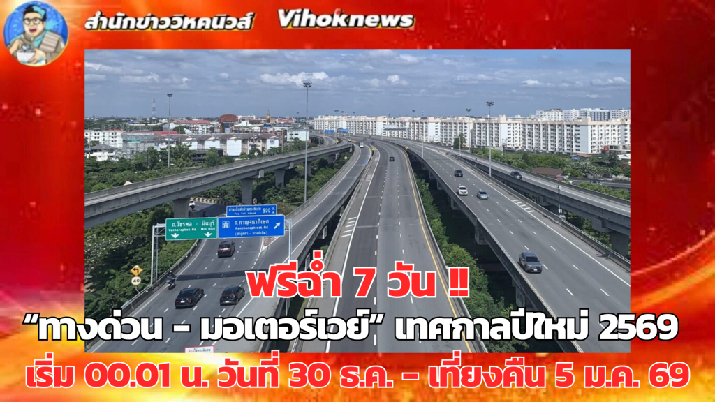 “ทางด่วน-มอเตอร์เวย์” ฟรีฉ่ำ 7 วันเทศกาลปีใหม่ 2569 เริ่ม 00.01 น. วันที่ 30 ธ.ค.-เที่ยงคืน 5 ม.ค. 69 ช่วยประชาชนลดค่าใช้จ่ายเดินทางกว่า 287 ล้าน M6 บางปะอิน-โคราช เปิดตลอดสายจัดเดินรถวันเวย์