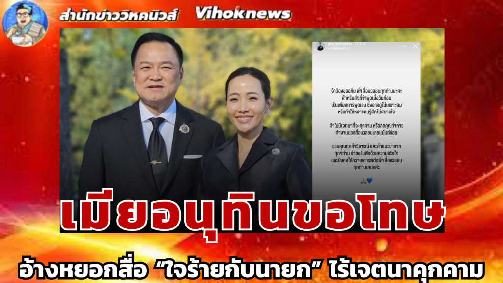 “จ๋า ธนนนท์” ภริยา “อนุทิน” โพสต์ขอโทษปมหยอกสื่อใจร้ายกับนายกฯ แจงแค่พูดเล่น-ไม่มีเจตนาคุกคามสื่อ น้อมรับคำวิจารณ์