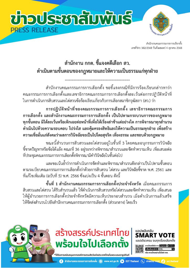 สำนักข่าวอิศรา (www.isranews.org) รายงานว่า วันที่ 4 ตุลาคม 2568 สำนักงานคณะกรรมการการเลือกตั้ง (กกต.) เผยแพร่เอกสารข่าวประชาสัมพันธ์ (PRESS RELEASE) เลขที่ข่าว 382/2568 ชี้แจงกรณีคดีเลือกสมาชิกวุฒิสภา (สว.) ดำเนินการตามขั้นตอนของกฎหมายและให้ความเป็นธรรมแก่ทุกฝ่าย ว่า การปฏิบัติหน้าที่ของคณะกรรมการ กกต. เลขาธิการคณะกรรมการกกต. และสำนักงานคณะกรรมการกกต. เป็นไปตามกระบวนการของกฎหมายทุกขั้นตอน มิได้ละเว้นหรือเพิกเฉยต่อหน้าที่เพื่อให้เรื่องล่าช้าแต่อย่างใด การพิจารณาทุกสำนวนดำเนินไปด้วยความรอบคอบ โปร่งใส และคุ้มครองสิทธิและให้ความเป็นธรรมทุกฝ่าย เพื่อสร้างความเชื่อมั่นแก่สังคมว่าผลการวินิจฉัยจะเป็นไปโดยสุจริต เที่ยงธรรม และชอบด้วยกฎหมาย