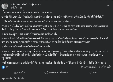 เรื่องนัวเนียมากมายเกี่ยวกับเงินของพรรคการเมือง ข่าวซัดกันไปมา เรื่องเงินค่าสมัครสมาชิก เงินผู้ช่วย สส.บริจาคเข้าพรรค อะไรเป็นเรื่องที่ทำได้ ทำไม่ได้ ว่า เงินสมัครสมาชิกพรรค คนของพรรคออกให้แทนประชาชนไม่ได้ ไม่ว่าจะเป็นค่าสมาชิกรายปี ๆ ละ 20 บาท หรือตลอดชีพ เพราะถือเป็นการเสนอให้เงิน เพื่อจูงใจให้เป็นสมาชิกพรรค แม้ 20 บาทก็ผิด พ.ร.ป. ว่าด้วยพรรคการเมือง