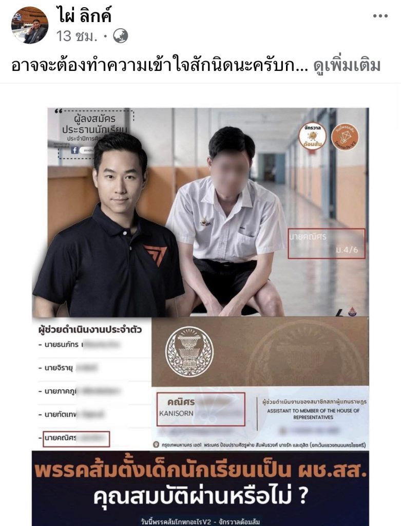 ไทยโพสต์-7 พฤศจิกายน 2568 – นายไผ่ ลิกค์ สส.กำแพงเพชร และเลขาธิการพรรคกล้าธรรม โพสต์เฟซบุ๊กระบุว่าอาจจะต้องทำความเข้าใจสักนิดนะครับการที่แต่งตั้งผู้ช่วย สส. ต้องรับรองโดย สส . ผู้นั้นทางรัฐสภาจะถือว่าท่าน สส.รับรองแล้ว ตั้งแต่เห็นยังไม่มีการตีกลับเลย เพราะถือเป็นความรับผิดชอบของท่าน การกระทำแบบนี้คือการบิดเบือนข้อเท็จจริงว่าคนผู้นี้มีคุณสมบัติที่ถูกต้อง ถ้าการเมืองตั้งแต่มัธยมศึกษาได้หรืออาจจะถึงประถมศึกษามันก็แปลก