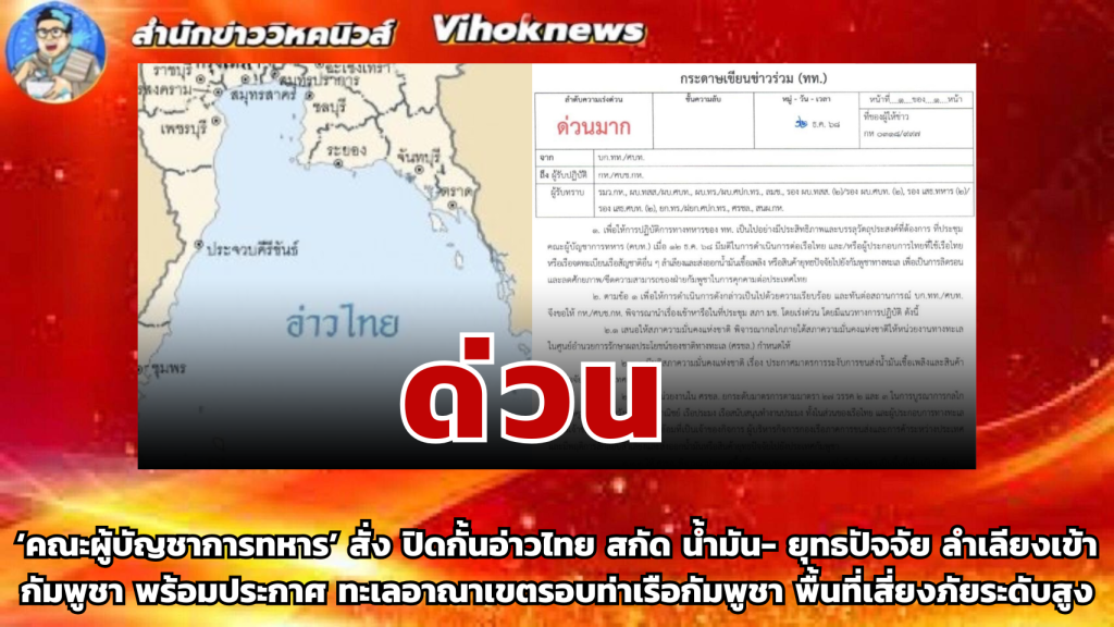 ด่วน! ‘คณะผู้บัญชาการทหาร’ สั่ง ปิดกั้นอ่าวไทย สกัด น้ำมัน- ยุทธปัจจัย ลำเลียงเข้ากัมพูชา พร้อมประกาศ ทะเลอาณาเขตรอบท่าเรือกัมพูชา พื้นที่เสี่ยงภัยระดับสูง