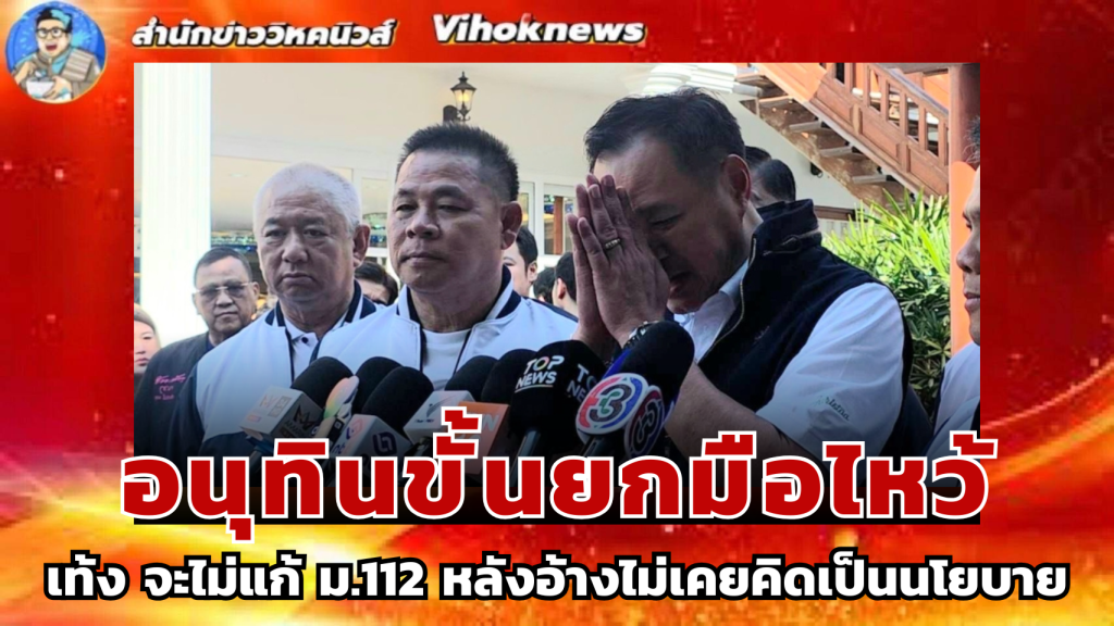 ไทยรัฐออนไลน์-วันที่ 27 ธันวาคม 2568 ที่จังหวัดสุพรรณบุรี นายอนุทิน ชาญวีรกูล ในฐานะหัวหน้าพรรคภูมิใจไทย ให้สัมภาษณ์ถึงกรณีที่ นายณัฐพงษ์ เรืองปัญญาวุฒิ หัวหน้าพรรคประชาชน กล่าวบนเวทีดีเบตว่า พรรคประชาชนไม่มีนโยบายในการแก้ไขมาตรา 112 แล้ว นายอนุทิน ย้อนถามผู้สื่อข่าวด้วยสีหน้าตกใจ พร้อมพูดว่า ยืนยันได้หรือเปล่า ท่านพูดว่าพรรคประชาชนไม่แก้ 112 ด้วย นายอนุทิน ได้ยกมือไหว้ท่วมหัว พร้อมกล่าวว่า ขอบพระคุณครับ ขอบพระคุณท่านจริงๆ ยิ่งเป็นความสบายใจของประชาชน ขอบคุณท่านจริงๆ