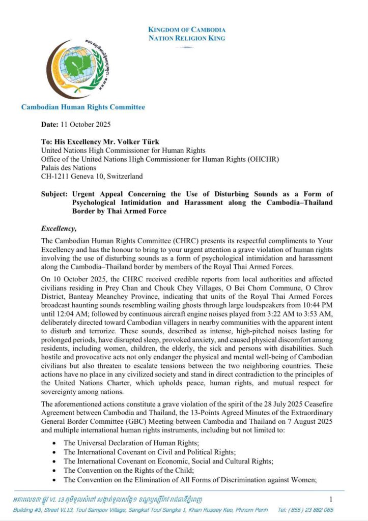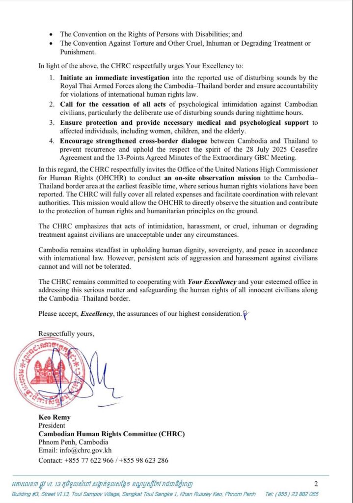 “คณะกรรมาธิการ ได้รับรายงานที่เชื่อถือได้จากเจ้าหน้าที่ท้องถิ่นและพลเรือนที่ได้รับผลกระทบในหมู่บ้านเปรย์จัน และจ็อกเจย์ ตำบลโอเบย์จอน อำเภอโอจรอว์ จังหวัดบันเตียเมียนเจย ระบุว่า หน่วยทหารแห่งราชอาณาจักรไทยได้กระจายเสียงที่มีลักษณะคล้ายเสียงโหยหวนของภูตผีผ่านลำโพงขนาดใหญ่ ตั้งแต่เวลา 22.44 น. จนถึงเวลา 00.04 น. จากนั้นได้เปิดเสียงเครื่องยนต์อากาศยานต่อเนื่อง ตั้งแต่เวลา 03.22 น. ถึงเวลา 03.53 น. โดยจงใจส่งเสียงไปยังชาวบ้านกัมพูชาในพื้นที่ใกล้เคียง ซึ่ง #มีเจตนาเพื่อรบกวนและข่มขวัญ เสียงเหล่านี้ ซึ่งถูกอธิบายว่าเป็นเสียงดังแหลมสูงและต่อเนื่องเป็นเวลานาน ได้ #สร้างความเดือดร้อนในการนอนหลับก่อให้เกิดความวิตกกังวลและสร้างความไม่สบายทางร่างกายในหมู่ชาวบ้าน รวมถึงสตรี เด็ก ผู้สูงอายุ ผู้ป่วย และคนพิการ การกระทำที่เป็นปฏิปักษ์และยั่วยุในลักษณะเช่นนี้ไม่เพียงเป็นอันตรายต่อสุขภาพกายและใจของพลเรือนกัมพูชาเท่านั้น แต่ยังอาจนำไปสู่การยกระดับความตึงเครียดระหว่างสองประเทศเพื่อนบ้าน การกระทำดังกล่าวไม่มีในสังคมอารยะใด ๆ และขัดแย้งโดยตรงกับหลักการของกฎบัตรสหประชาชาติ (These actions have no place in any civilized society and stand in direct contradiction to the principles of the United Nations Charter) ซึ่งยึดมั่นในสันติภาพ สิทธิมนุษยชน และการเคารพอธิปไตยซึ่งกันและกันระหว่างประเทศ การกระทำดังกล่าวถือเป็นการละเมิดอย่างร้ายแรงต่อเจตนารมณ์ของ ข้อตกลงหยุดยิงระหว่างกัมพูชาและไทย เมื่อวันที่ 28 กรกฎาคม 2025 และ บันทึกข้อตกลง 13 ข้อของการประชุมคณะกรรมการชายแดนร่วม (GBC) สมัยวิสามัญระหว่างกัมพูชาและไทย เมื่อวันที่ 7 สิงหาคม 2025”
