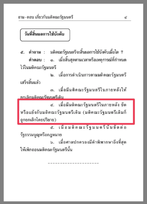 4.เมื่อมีมติคณะรัฐมนตรีในภายหลังขัด หรือแย้งกับมติคณะรัฐมนตรีเดิม (มติคณะรัฐมนตรีเดิมก็ถูกยกเลิกโดยปริยาย)