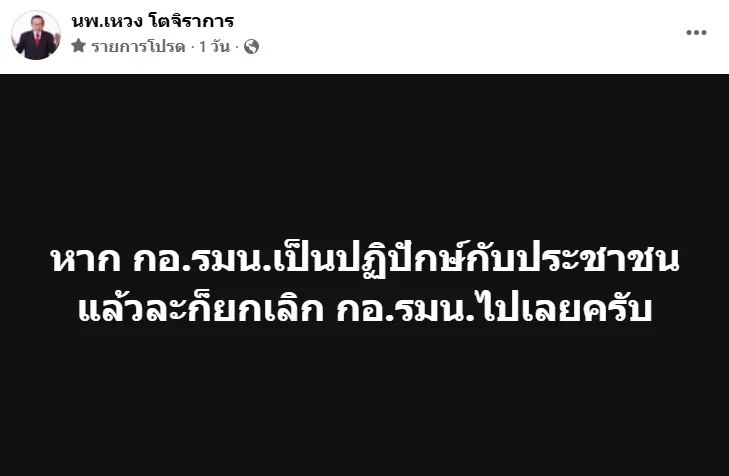 ไทยโพสต์ -18 เมษายน 2569 – นพ.เหวง โตจิราการ อดีตแกนนำแนวร่วมประชาธิปไตยต่อต้านเผด็จการแห่งชาติ (นปช.) โพสต์เฟซบุ๊กว่า “หาก กอ.รมน.เป็นปฏิปักษ์กับประชาชนแล้วละก็ยกเลิก กอ.รมน.ไปเลยครับ”