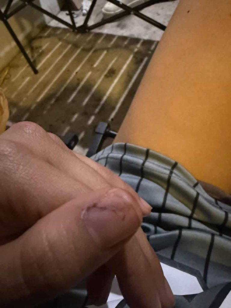 ไฟตีหัวแตกเป็นแผลเลือดอาบเต็มพื้นห้องเรย เอา มีดฟันที่นิ้ว แล้วมันยังถามอีกว่า จะตัดมือตัวเองออกมา รีว่าจะให้มันตัดเอง จนน้องเข้าไปกราบขอร้องขอชีวิต จนมันได้สติเลยพาไปโรงพยาบาลแล้วก็เรียกตำรวจมาแจ้งความไป จนมันโดนตำรวจพาไปโรงพัก แต่ไม่มีอะไรคืบหน้า