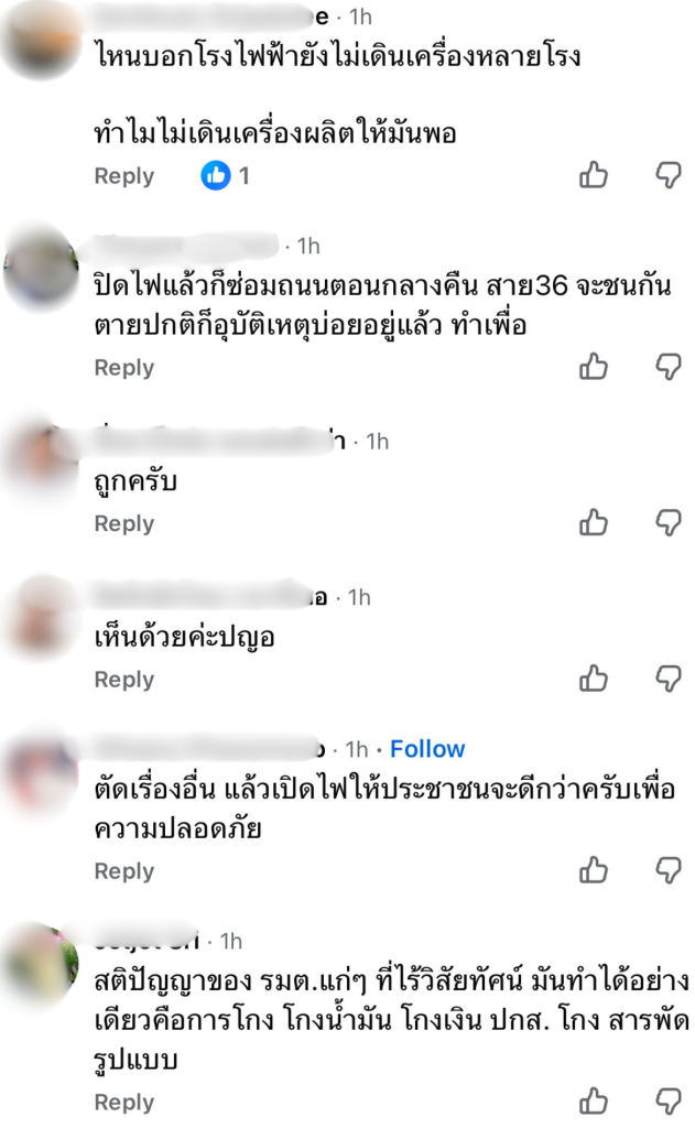 นอกจากนี้ยังชี้ว่า มีวิธีการลดการใช้พลังงานอีกมาก แต่การเลือก “ปิดไฟถนน” อาจเป็นการลดต้นทุนโดยแลกกับความปลอดภัย พร้อมตั้งข้อสังเกตว่า แนวทางดังกล่าวอาจเป็นเพียงการตอบโจทย์เชิงนโยบาย มากกว่าคำนึงถึงผลกระทบต่อประชาชน