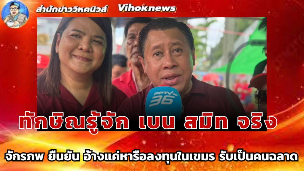 เมื่อถามถึงกรณีที่ก่อนหน้านี้ปรากฏภาพข่าวว่านายทักษิณ ชินวัตร ได้เคยมีการไปนั่งพูดคุยสนทนากับนายเบนจามิน เมาเออร์เบอร์เกอร์ หรือเบน สมิธ อยากจะชี้แจงแทนอย่างไรหรือไม่ เนื่องจากตอนนี้มีข่าวว่าบุคคลดังกล่าวอาจมีส่วนเกี่ยวข้องกับเครือข่ายองค์กรอาชญากรรมข้ามชาติ นายจักรภพ กล่าวว่า นายเบน เป็นคนของนายฮุนเซน ซึ่งนายฮุนเซน ได้เป็นคนแนะนำนายเบน ให้กับนายทักษิณ โดยบอกว่าถ้าอยากทำธุรกิจในกัมพูชา ต้องคุยกับคนนี้ คนนี้ช่วยได้ แต่อย่าลืมว่าตอนที่นายทักษิณได้ไปเจอครั้งแรกนั้น ท่านเป็นเพียงประชาชนทั่วไป ไม่ได้มีหน้าทางการเมือง
