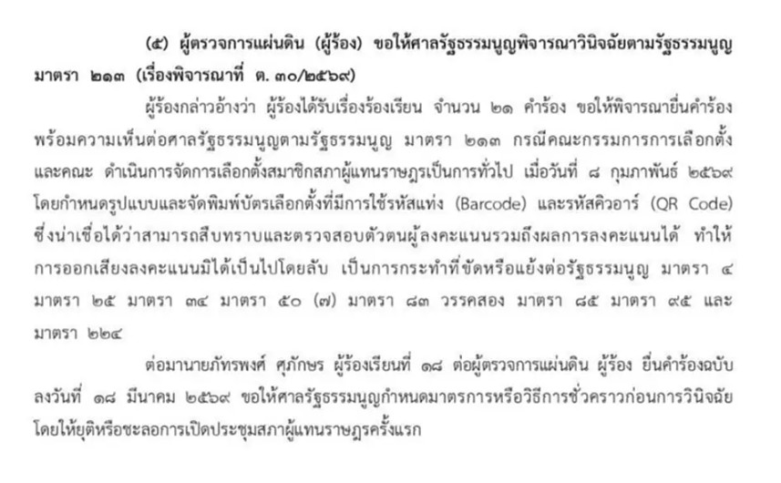 วันที่ 1 เมษายน 2569 ศาลรัฐธรรมนูญ ได้ประชุมปรึกษาคดีที่สำคัญและเป็นที่สนใจ จำนวน 7 เรื่อง โดยคดีที่ผู้ตรวจการแผ่นดิน ผู้ร้อง ขอให้ศาลรัฐธรรมนูญพิจารณาวินิจฉัย กรณีผู้ตรวจการแผ่นดิตได้รับเรื่องร้องเรียน จำนวน 21 คำร้อง ขอให้พิจารณายื่นคำร้อง พร้อมความเห็นต่อศาลรัฐธรรมนูญตามรัฐธรรมนูญ มาตรา 233 กรณีคณะกรรมการการเลือกตั้ง หรือ กกต.และคณะ ดำเนินการจัดการเลือกตั้ง สส. เมื่อวันที่ 8 กุมภาพันธ์ 2569 โดยกำหนดรูปแบบและจัดพิมพ์บัตรเลือกตั้งที่มีการใช้รหัสแท่ง หรือ Barcode และรหัสQR Code ซึ่งน่าเชื่อให้ว่าสามารถสืบทราบและตรวจสอบตัวตนผู้ลงคะแนนรวมถึงผลการลงคะแนนได้ ทำให้การออกเสียงลงคะแนนมิได้เป็นไปโดยลับ เป็นการกระทำที่ขัดหรือแย้งต่อรัฐธรรมนูญ
