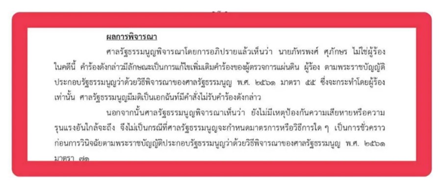 ศาลรัฐธรรมนูญพิจารณาโดยการอภิปรายแล้วเห็นว่า นายภัทรพงศ์ไม่ใช่ผู้ร้องในคดีนี้ คำร้องดังกล่าวมีลักษณะเป็นการแก้ไขเพิ่มเติมคำร้องของผู้ตรวจการแผ่นดิน ตามพระราชบัญญัติประกอบรัฐธรรมนูญว่าด้วยวิธีพิจารณาของศาลรัฐธรรมนูญ พ.ศ.2561 มาตรา 55 ซึ่งจะกระทำโดยผู้ร้อง เท่านั้นศาลรัฐธรรมนูญมีมติเป็นเอกฉันท์มีคำสั่งไม่รับคำร้องดังกล่าว