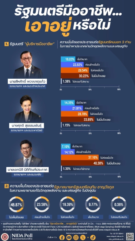 5 เมษายน 2569 ศูนย์สำรวจความคิดเห็น “นิด้าโพล” เปิดเผยผลสำรวจเรื่อง “รัฐมนตรีมืออาชีพ…เอาอยู่หรือไม่” หลังสุ่มสำรวจความคิดเห็นประชาชนทั่วประเทศจำนวน 1,310 หน่วยตัวอย่าง เกี่ยวกับการทำงานของรัฐบาลภายใต้การนำของ นายอนุทิน ชาญวีรกูล
