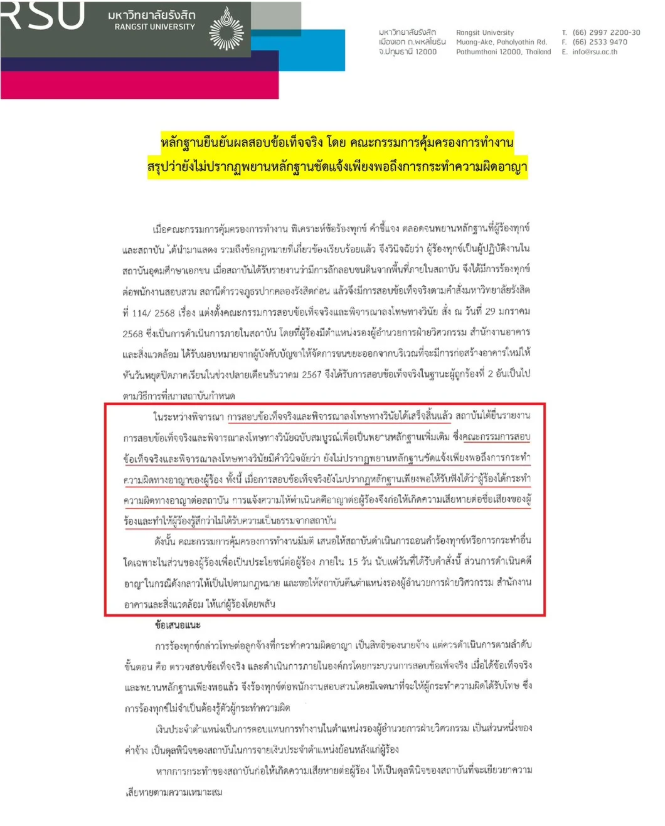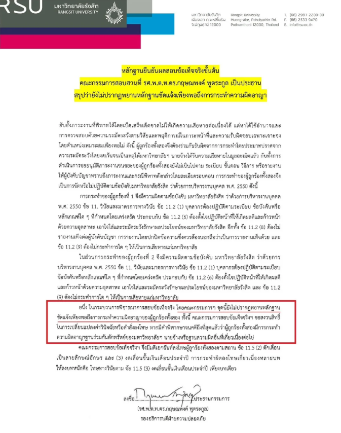 มหาวิทยาลัยรังสิต ยึดถือความโปร่งใสและหลักธรรมาภิบาลเป็นสำคัญ การดำเนินการทุกขั้นตอนเป็นไปตามระเบียบ ข้อบังคับ หลักกฎหมายอย่างเคร่งครัด และจะขอเรียนชี้แจงเกี่ยวกับกรณีนี้เป็นครั้งสุดท้าย หากพบว่ายังมีการเผยแพร่ข้อมูลเท็จ มหาวิทยาลัยพร้อมที่จะนำพยาน หลักฐาน เข้าสู่กระบวนการยุติธรรม ตามขั้นตอนของกฎหมายต่อไป