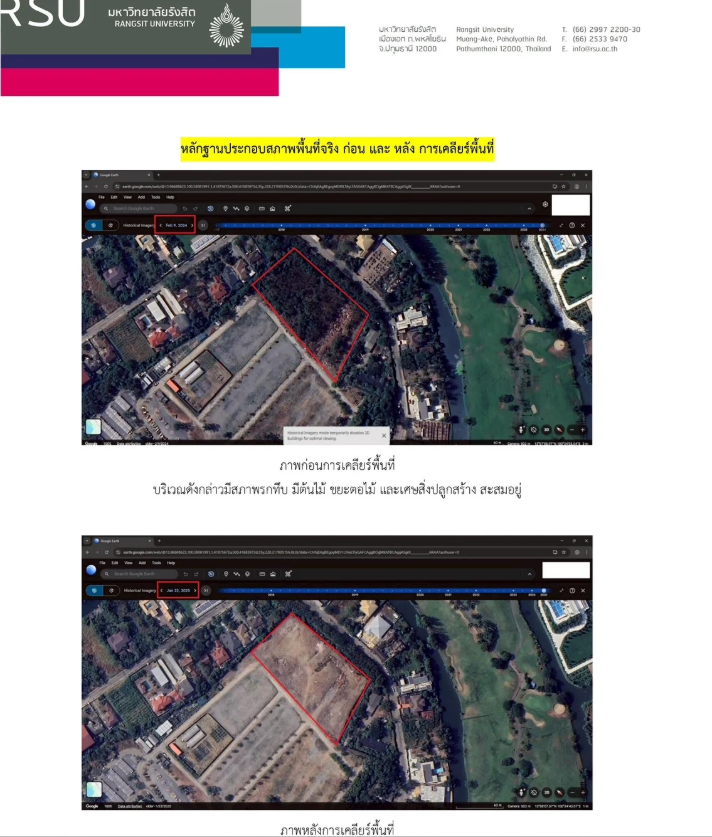 - การปรับพื้นที่เพื่อเตรียมไว้สำหรับเป็นบ้านพักคนงาน ในโครงการก่อสร้างอาคารเรียนใหม่ ไม่ได้มีความเสียหายเกิดขึ้นต่อมหาวิทยาลัย โดยพิจารณาจากเจตนาที่แท้จริงของการเคลียร์พื้นที่ (Site Clearing) ตามคำนิยามในทางวิศวกรรม หมายถึง กระบวนการเตรียมพื้นที่ก่อนการก่อสร้าง โดยการถางป่า ขุดตอไม้ รื้อถอนสิ่งปลูกสร้างเดิม ปรับระดับดินและขนย้ายเศษวัสดุออก เพื่อให้เป็นพื้นที่โล่งเตียน ปลอดภัย เพื่อลดค่าใช้จ่ายในโครงการก่อสร้าง ซึ่งเป็นไปตามร่างขอบเขตการดำเนินงาน (TOR) ว่าจ้างผู้รับเหมา เมื่อทำการเคลียร์พื้นที่แล้ว ปรากฏภาพพื้นที่ราบเรียบ ไม่มีหลุมบ่อใดๆ แสดงให้เห็นว่า การขนขยะที่มีดินปนอยู่เป็นส่วนหนึ่งของเจตนาในการเคลียร์พื้นที่ หลักฐานสำคัญนี้ มหาวิทยาลัยรังสิตในฐานะเจ้าของทรัพย์ เห็นว่าไม่ใช่การลักทรัพย์