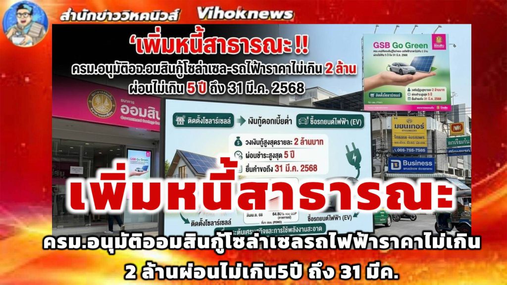 ครม. เห็นชอบ มาตรการหนุนการใช้พลังงานสะอาด ให้ธนาคารออมสิน ออกสินเชื่อดอกเบี้ยต่ำ (Soft Loan) วงเงิน 5,000 ล้านบาท สำหรับติดตั้ง Solar Cell หรือซื้อรถยนต์ไฟฟ้า (EV) , จักรยานยนต์ไฟฟ้า วงเงินกู้สูงสุด 2 ล้านบาทต่อราย ผ่อนนาน 5 ปี ดอกเบี้ยพิเศษ ยื่นคำขอได้ถึง 31 มี.ค. 2570