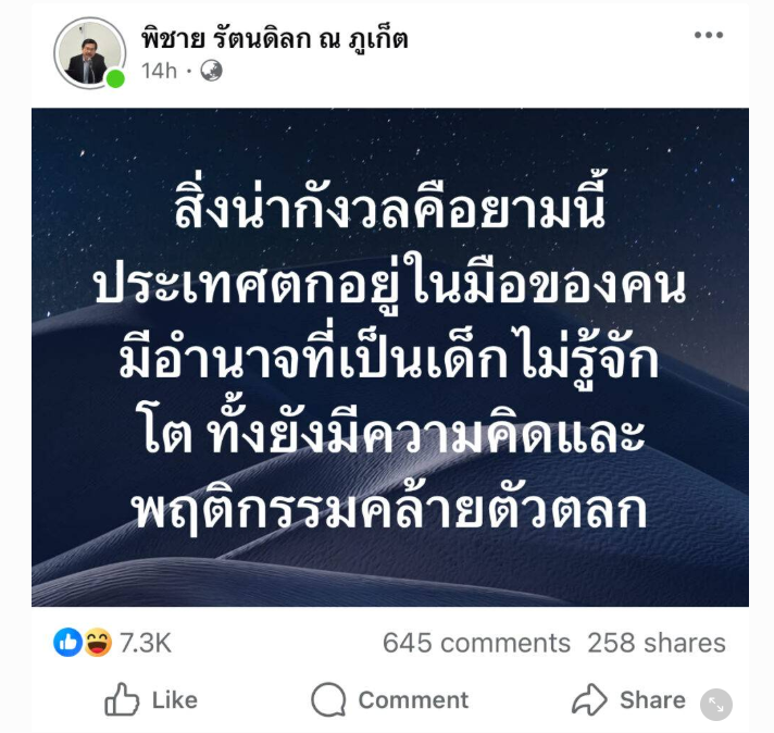 วิหคนิวส์-วันที่ 25 เม.ย. 2569 ผู้สื่อข่าวรายงานว่า รองศาสตราจารย์ ดร.พิชาย รัตนดิลก ณ ภูเก็ต อดีตคณบดี และอาจารย์ประจำหลักสูตรการเมืองและยุทธศาสตร์การพัฒนา ได้แสดงความคิดเห็นทางการเมืองอย่างเผ็ดร้อน โดยระบุว่า สถานการณ์บ้านเมืองในขณะนี้น่าเป็นห่วงอย่างยิ่ง