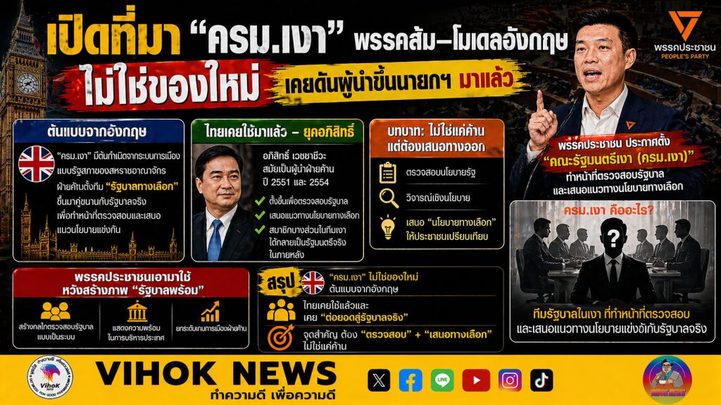 ข้อมูลระบุว่า “ครม.เงา” มีต้นกำเนิดจากระบบการเมืองแบบรัฐสภาของ สหราชอาณาจักร ซึ่งฝ่ายค้านจะตั้งทีม “รัฐบาลทางเลือก” ขึ้นมาคู่ขนานกับรัฐบาลจริง เพื่อทำหน้าที่ตรวจสอบและเสนอแนวนโยบายแข่งกัน