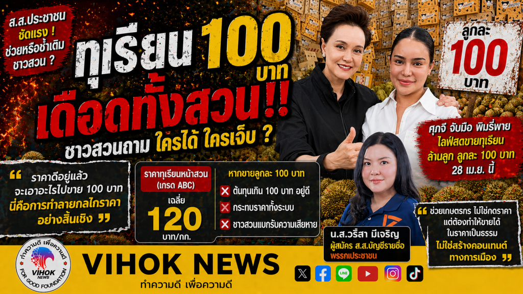 สำนักข่าววิหคนิวส์ | 27 เม.ย. 2569 ประเด็นร้อนในวงการเกษตรถูกพูดถึงอย่างหนัก หลังมีแผนจัดกิจกรรมไลฟ์สดจำหน่ายทุเรียนหน้าสวนในราคาลูกละ 100 บาท โดยตั้งเป้าจำหน่ายให้ได้ถึง 1 ล้านลูก ทำให้เกิดเสียงวิพากษ์วิจารณ์ในหมู่ชาวสวนและสังคมออนไลน์อย่างกว้างขวาง