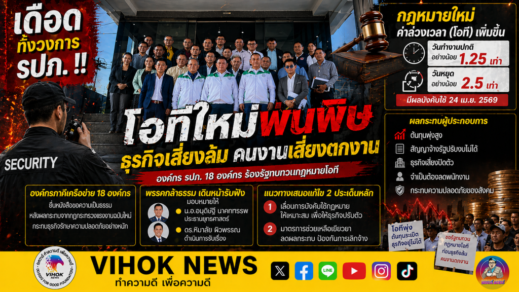 สำนักข่าววิหคนิวส์ | 27 เม.ย. 2569-พรรคกล้าธรรมเดินหน้ารับฟังเสียงผู้ประกอบการรักษาความปลอดภัย หลังเครือข่าย 18 องค์กรเข้ายื่นหนังสือร้องเรียนผลกระทบจากกฎกระทรวงแรงงานฉบับใหม่ ที่กำหนดอัตราค่าล่วงเวลา (โอที) เพิ่มขึ้น